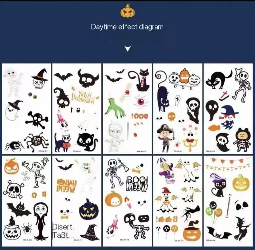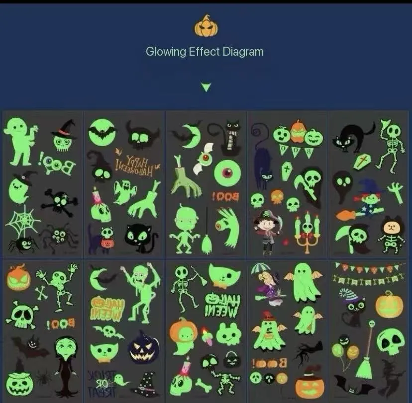 Хэллоуин түнгі жарқылмен татуировкасы - Хэллоуин мерекесіне арналған шығармашылық сәндік зат. Ол eCO-таза жарқылдан жасалған, қараңғы сия материалынан жасалған және трендді татуировкалар үлгісін біріктіреді. Күні ішінде ол табиғи түс немесе қара татуировкасы әсерін, ал түнде ол керемет флуоресцентті жарықты шығарады, бұл сізге Хэллоуин кештерінде, көше партияларында және тақырыптық іс-шараларда оңай назар аударуға мүмкіндік береді. Спиринг және квирки сияқты елес тәрізді дизайнды іздеп жүрсеңіз де, жұмбақ және романтикалық атмосфераны қалайсыз ба, сіз өзіңіздің сүйікті нұсқаңызды байқалып, түрлі үлгілердің арасында таба аласыз. Сіз татуировкалардың ауырсынуын және тұрақтылығын өтеусіз Halloween-opthed-optfit-ті қызықтыра аласыз.