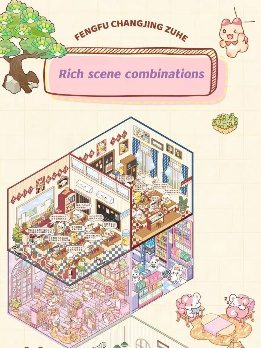 Бұл кішірейтілген сахна стикерлері әр томда әртүрлі стильдерді қамтитын 10 түрлі тақырыптық көріністерді қамтиды. Ол стресті жеңілдету, ойын-сауық, интеллектуалдық даму және безендіру функцияларын біріктіріп, оны балаларға, жасөспірімдерге және жас ересектерге қолайлы етеді. Бұл күнделікті демалыс, ата-ана мен бала арасындағы қарым-қатынас және фестивальдерге сыйлық ретінде тамаша таңдау.