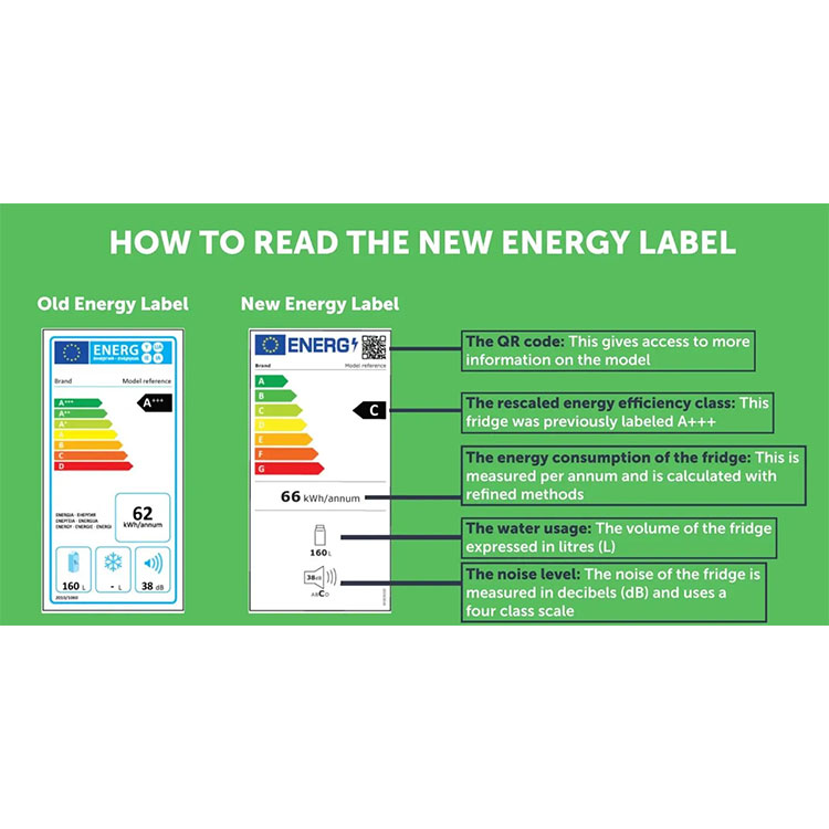 Тоңазытқыштың энергия тиімділігінің жапсырмаларыОлар әдетте төзімді материалдардан жасалған, оңай сәйкестендіру үшін ерекше түстері мен графикасы бар белгілер болып табылады.Тоңазытқыштың энергия тиімділігінің жапсырмаларытоңазытқыштың қуат тұтыну өнімділігін анық көрсету үшін әдетте әріптік немесе жұлдызшалық бағалау жүйесін пайдаланатын қуат тиімділігі деңгейлерінің белгішелерін қамтиды.