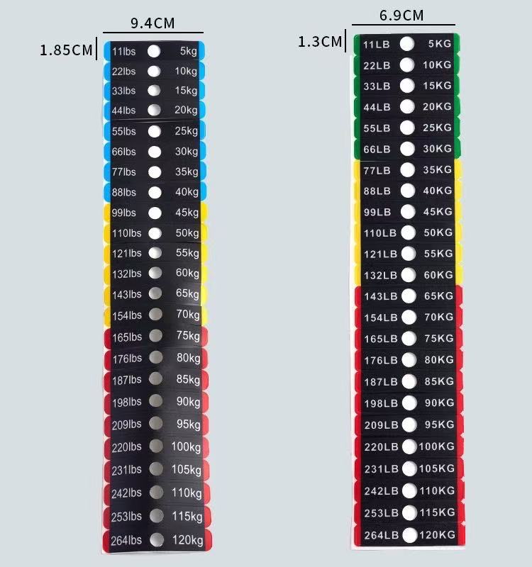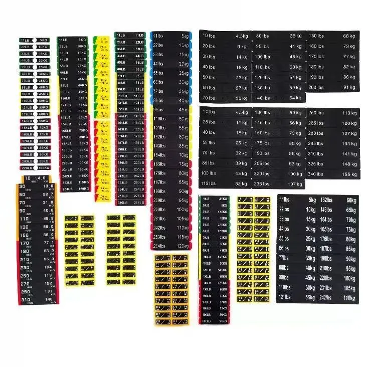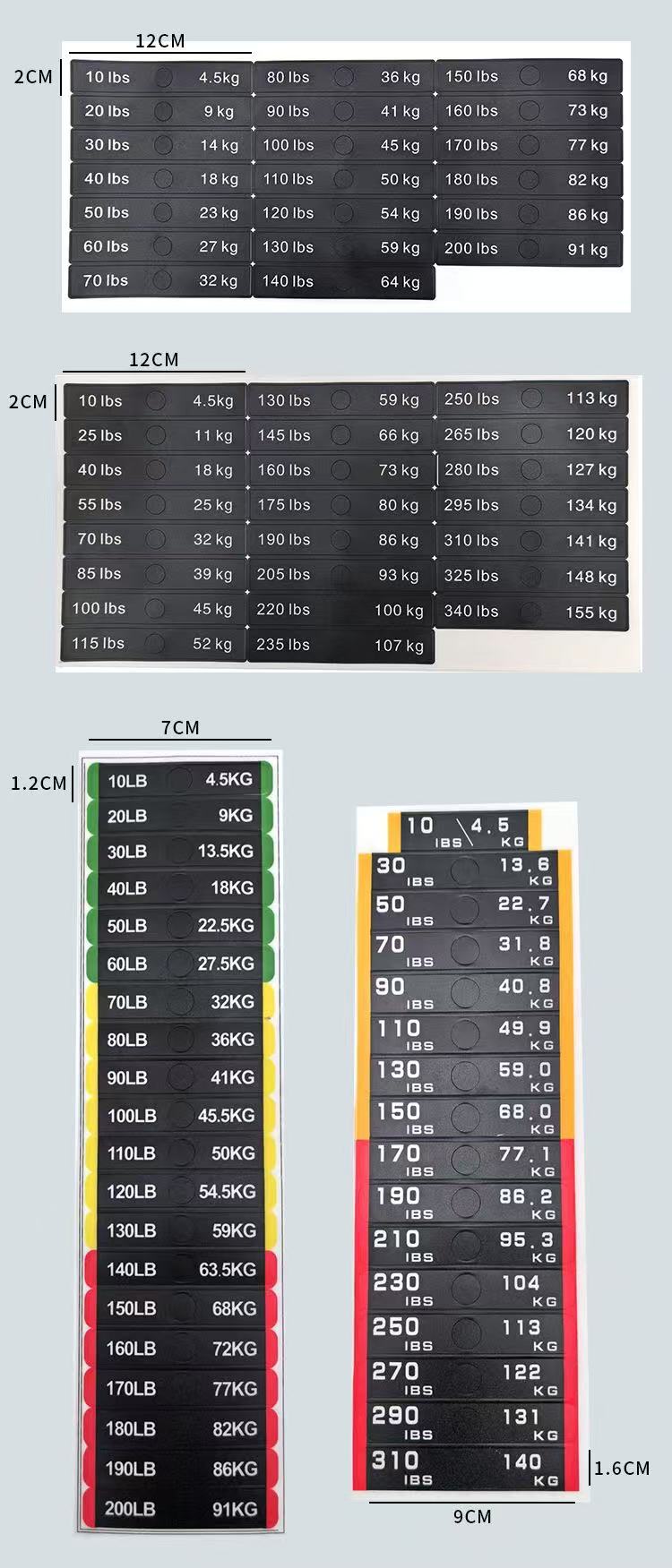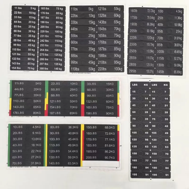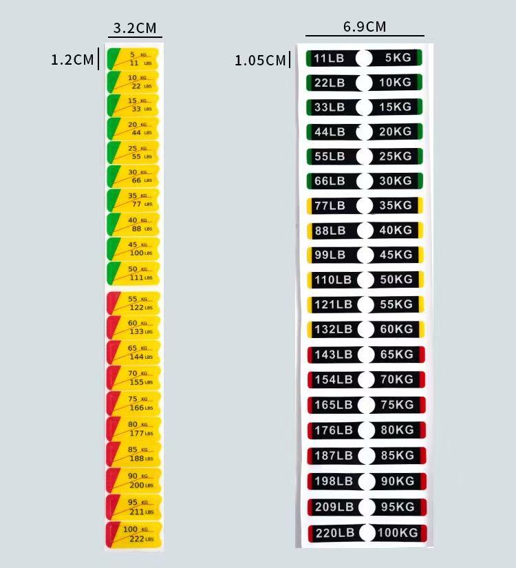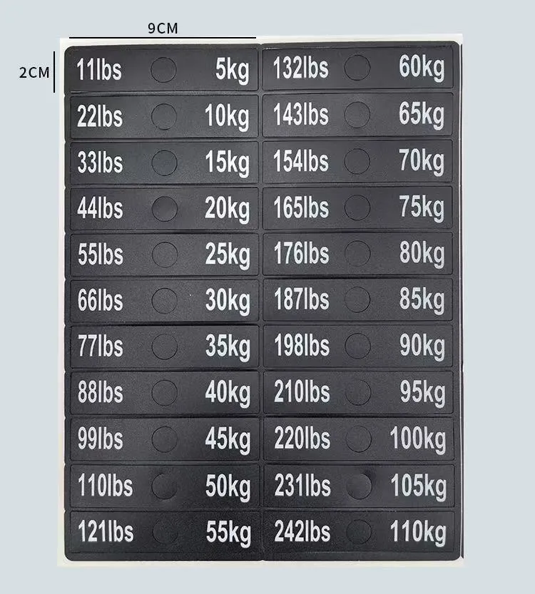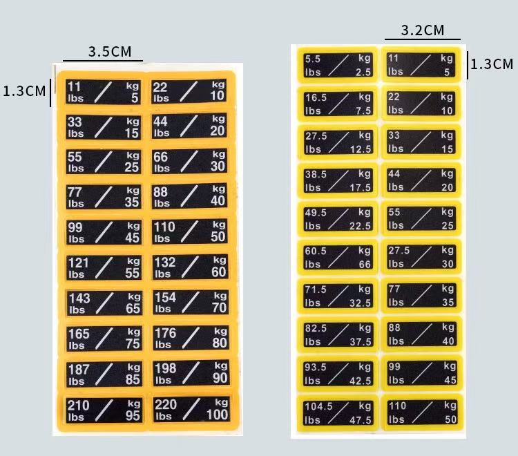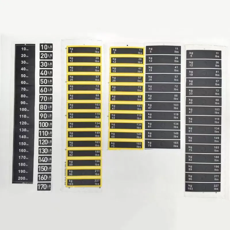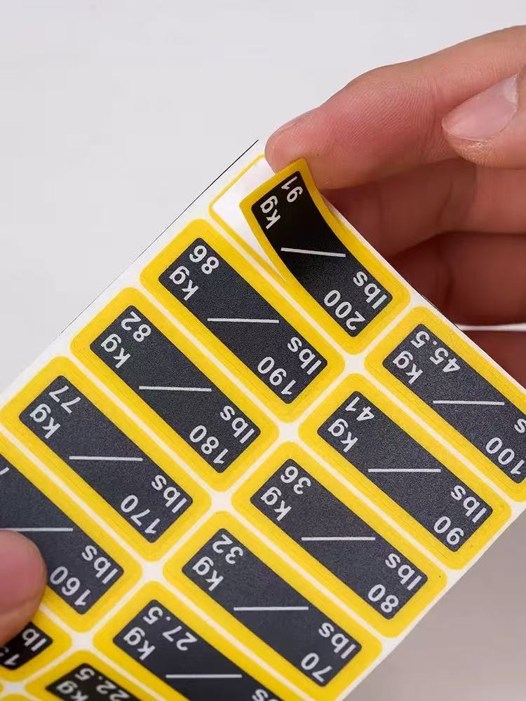 Фитнес жабдықтарының салмақ блоктарына арналған бұл салмақ жапсырмалары фитнес құралдарының салмағын таңбалау үшін арнайы әзірленген сәйкестендіру жапсырмаларының бір түрі болып табылады. Олар әдетте ПВХ материалынан жасалған және нақты өлшемдер үшін өнімнің параметрлер кестесіне жүгінуге болады. Салмақ мәндері стикерлерде анық белгіленген, бұл пайдаланушыларға сәйкес жаттығу салмағын жылдам анықтауға және таңдауға мүмкіндік береді.